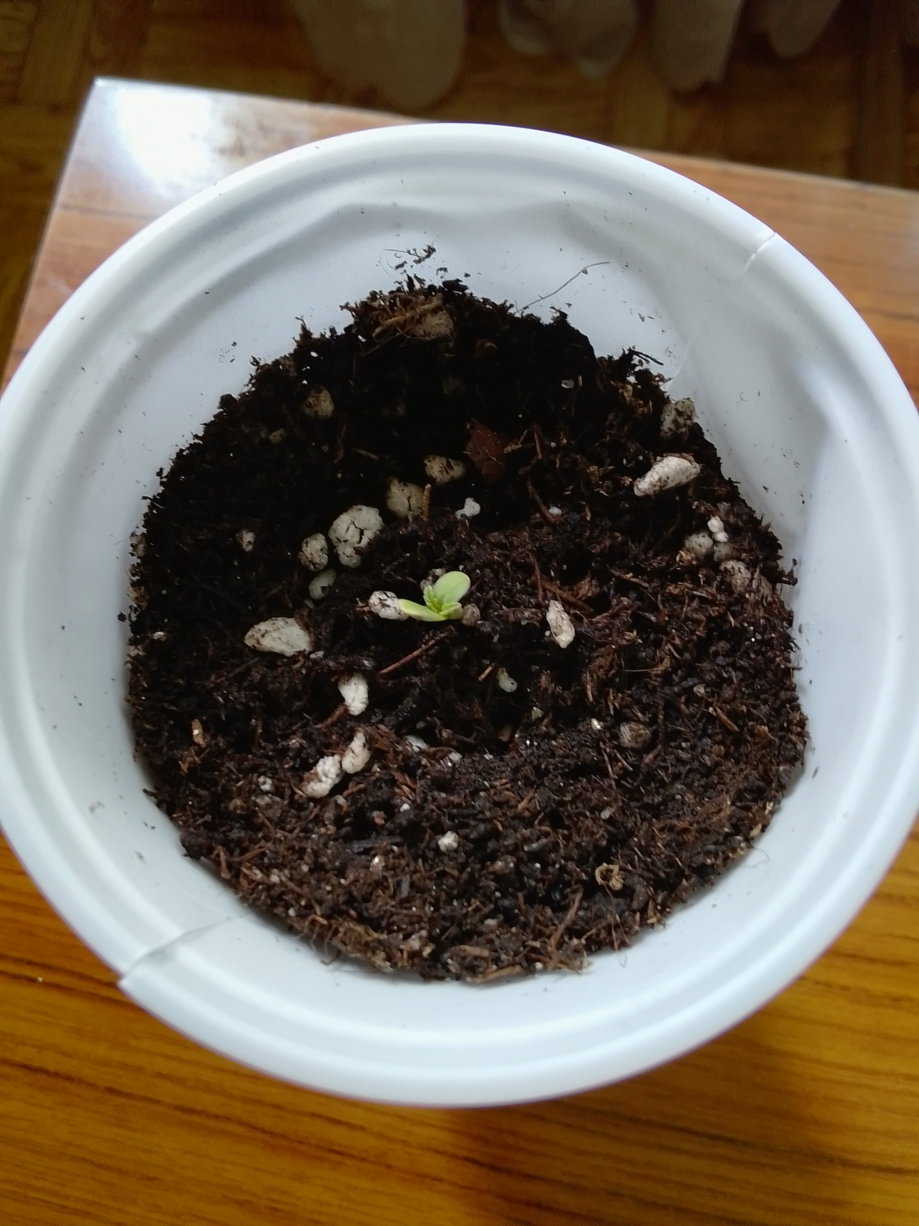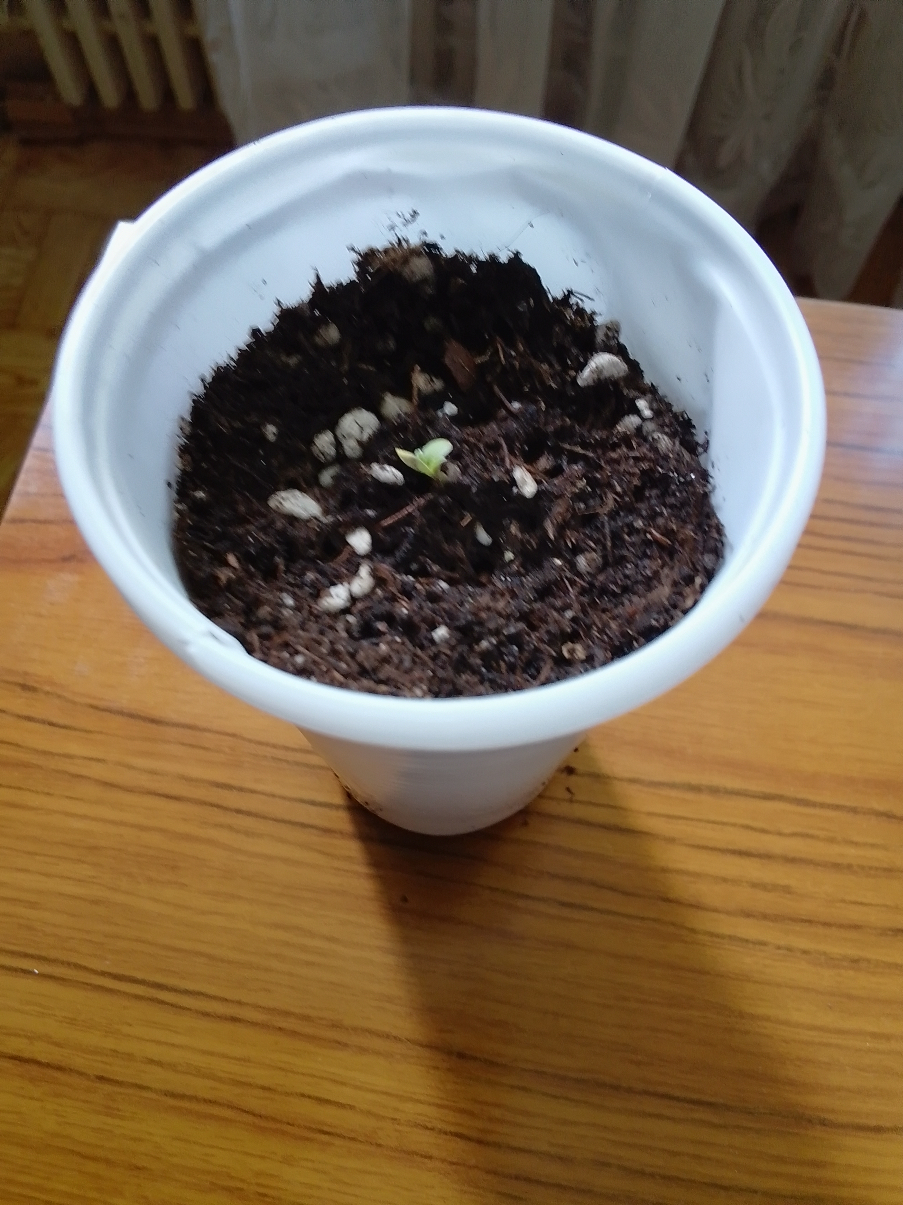 Все три взошли,сажал в разное время,последнее проросло на вторые сутки с утра в воде с перекесью,в обед в растворе скинул каску и корешок был 2 см примерно,и семядоли раскрылись.Был посажен в срочном порядке.На фото 1 день от каски.